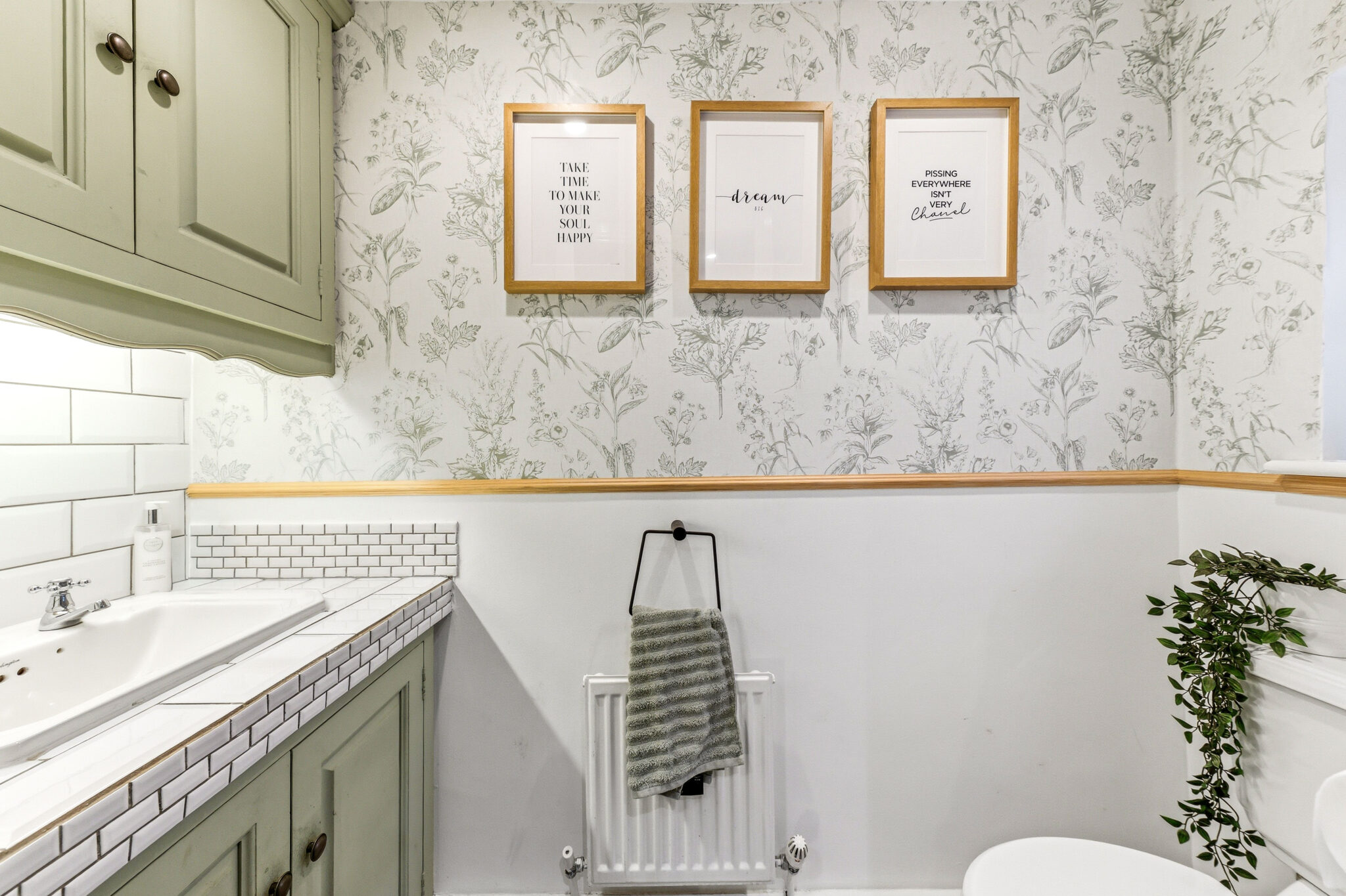 The modern cloakroom is ideal for guests and boasts a contemporary toilet and wash basin alongside beautiful feature wallpaper decoration.