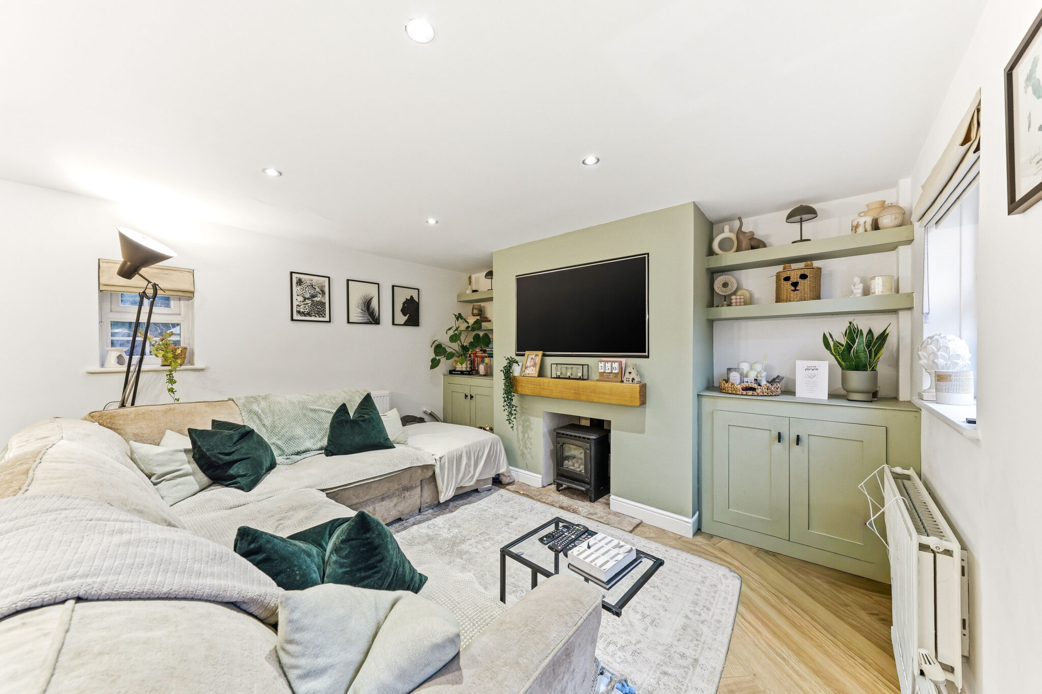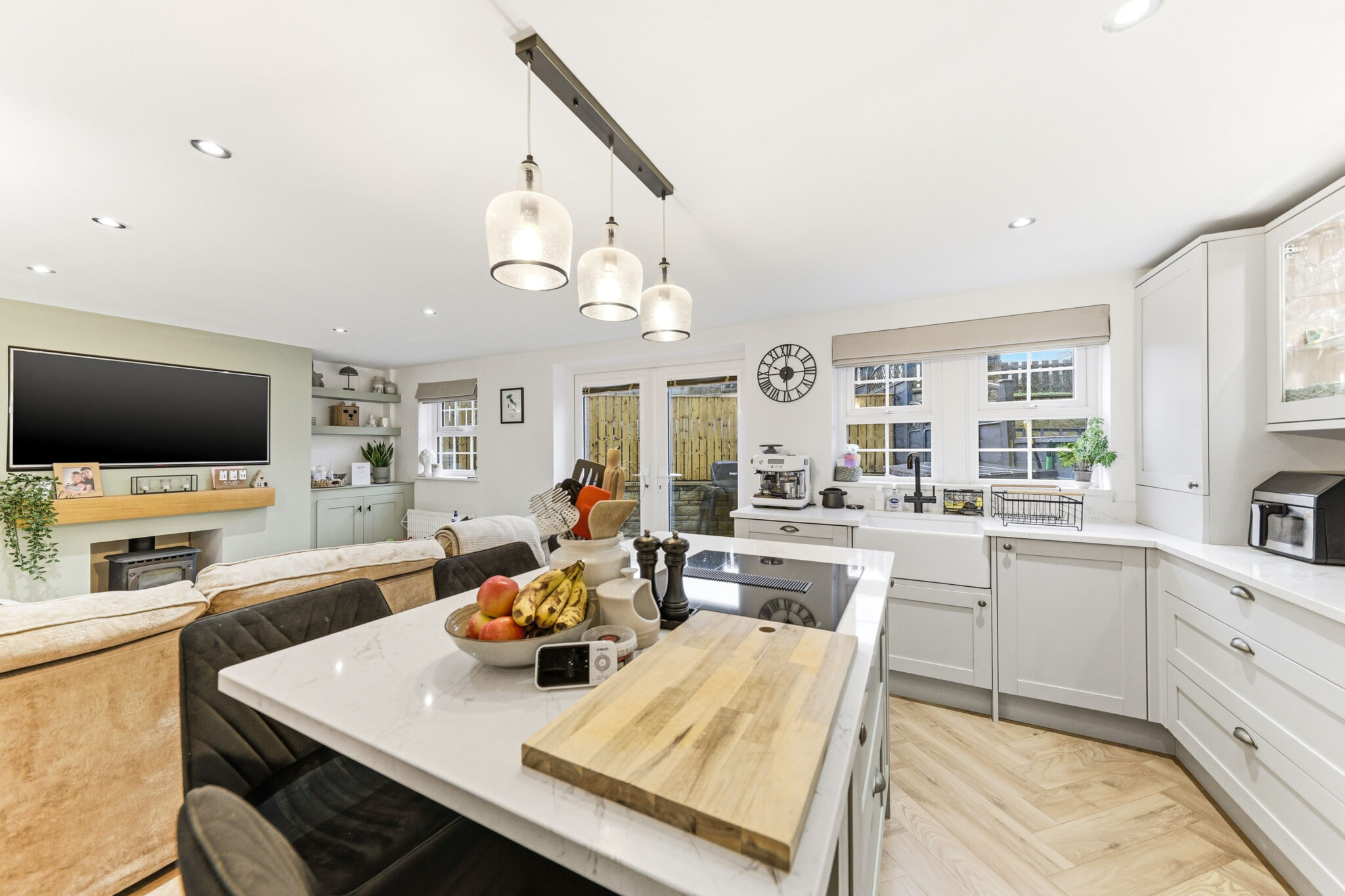 The welcoming living area flows effortlessly from the kitchen and offers a fabulous place to relax and unwind. The space boasts a warm colour scheme and offers a beautiful feature fireplace alongside bespoke cabinetry and shelving. Finally patio doors lead to the fantastic garden.