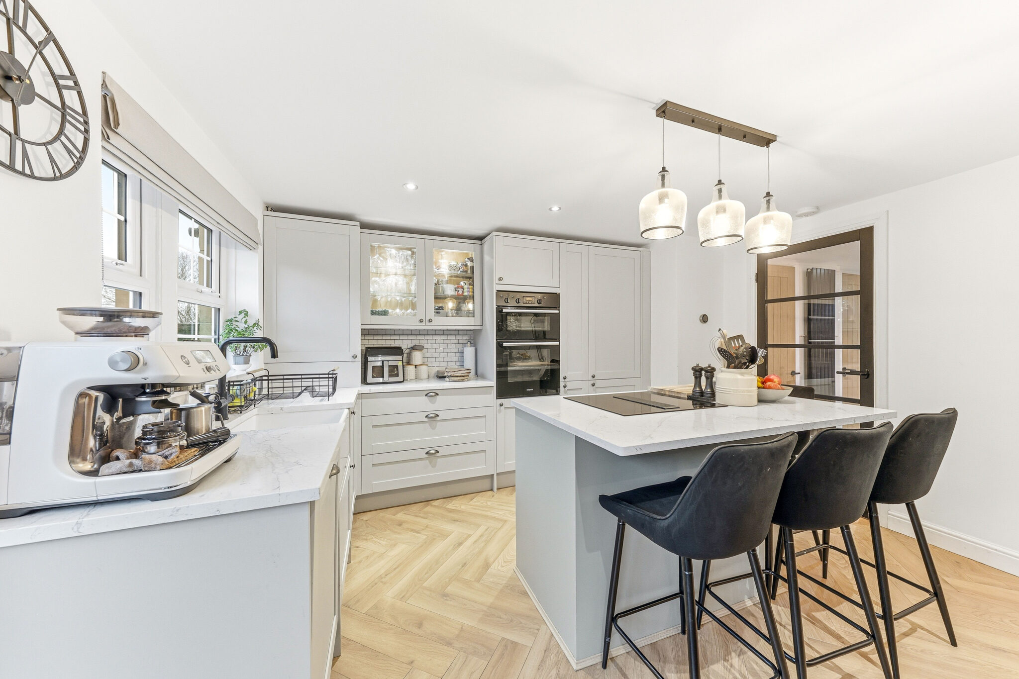 The impressive kitchen is a truly wonderful space for the whole family. The kitchen boasts a selection of cupboards that provide plenty of storage alongside a host of integrated appliances such as a dishwasher, fridge freezer and a tap offering both boiling and filtered cold water. The space is complimented further with recently installed flooring and a quartz worktop. The contemporary island is a fabulous feature and offers ample space for dining alongside additional storage. Furthermore this room is bursting with light with vast windows that bathe the room to create a bright and airy ambience.