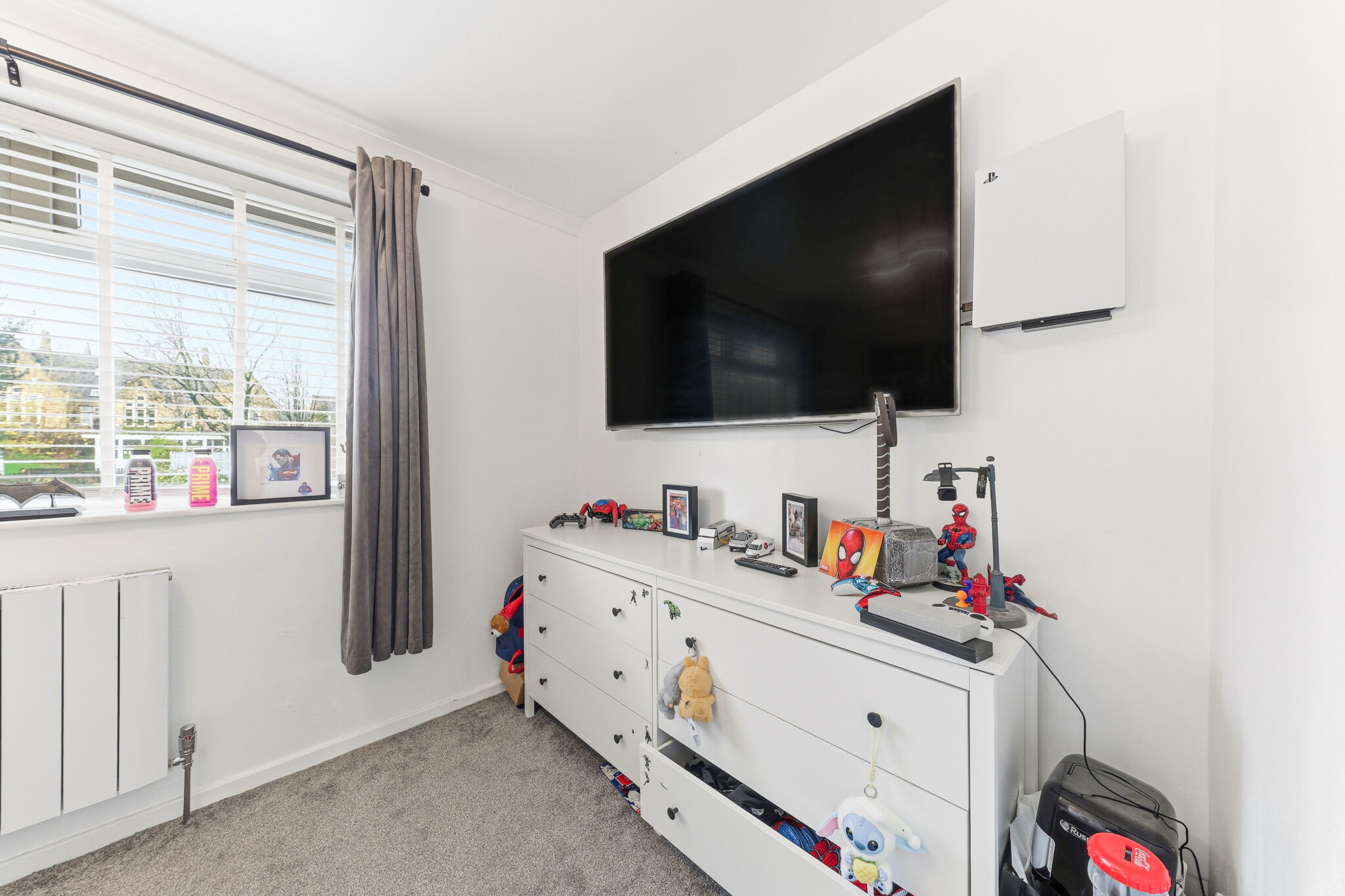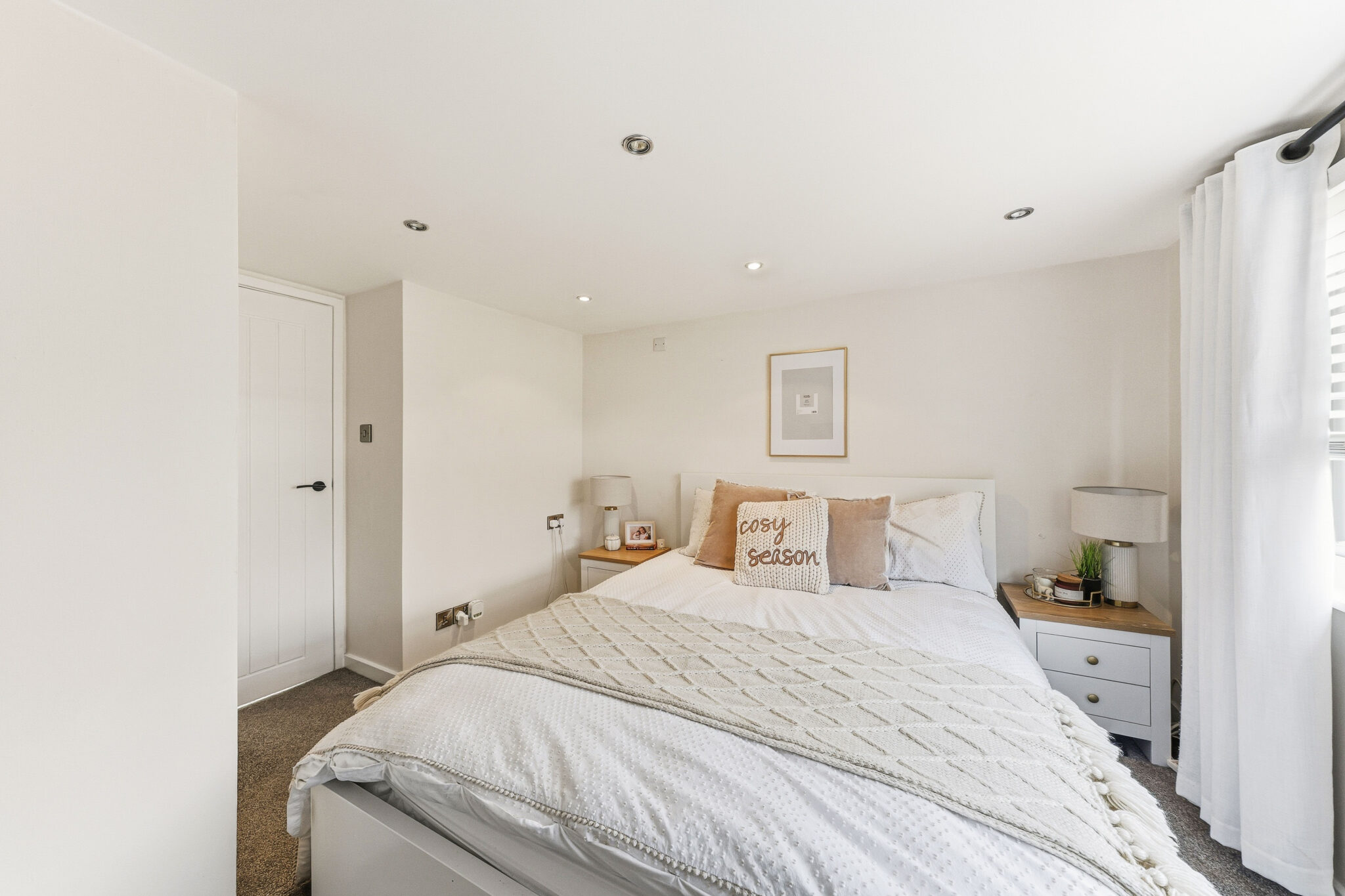 The first bedroom benefits from a warm grey colour scheme with sumptuous carpet and softly painted walls as well as large windows that create a truly tranquil ambience.