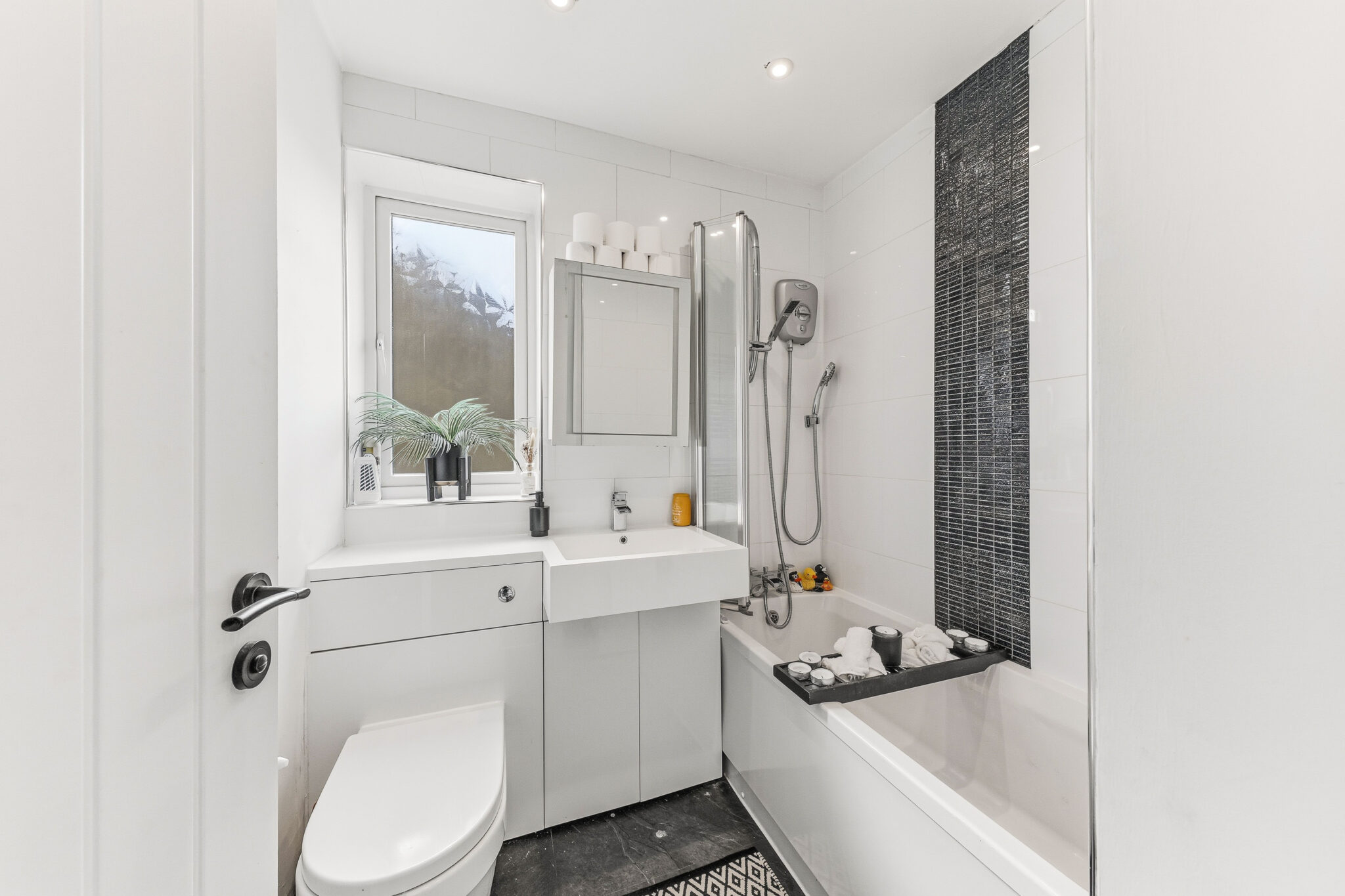 The modern bathroom benefits from a truly elegant finish with a stunning feature wall alongside a stylish bath, toilet and sink.