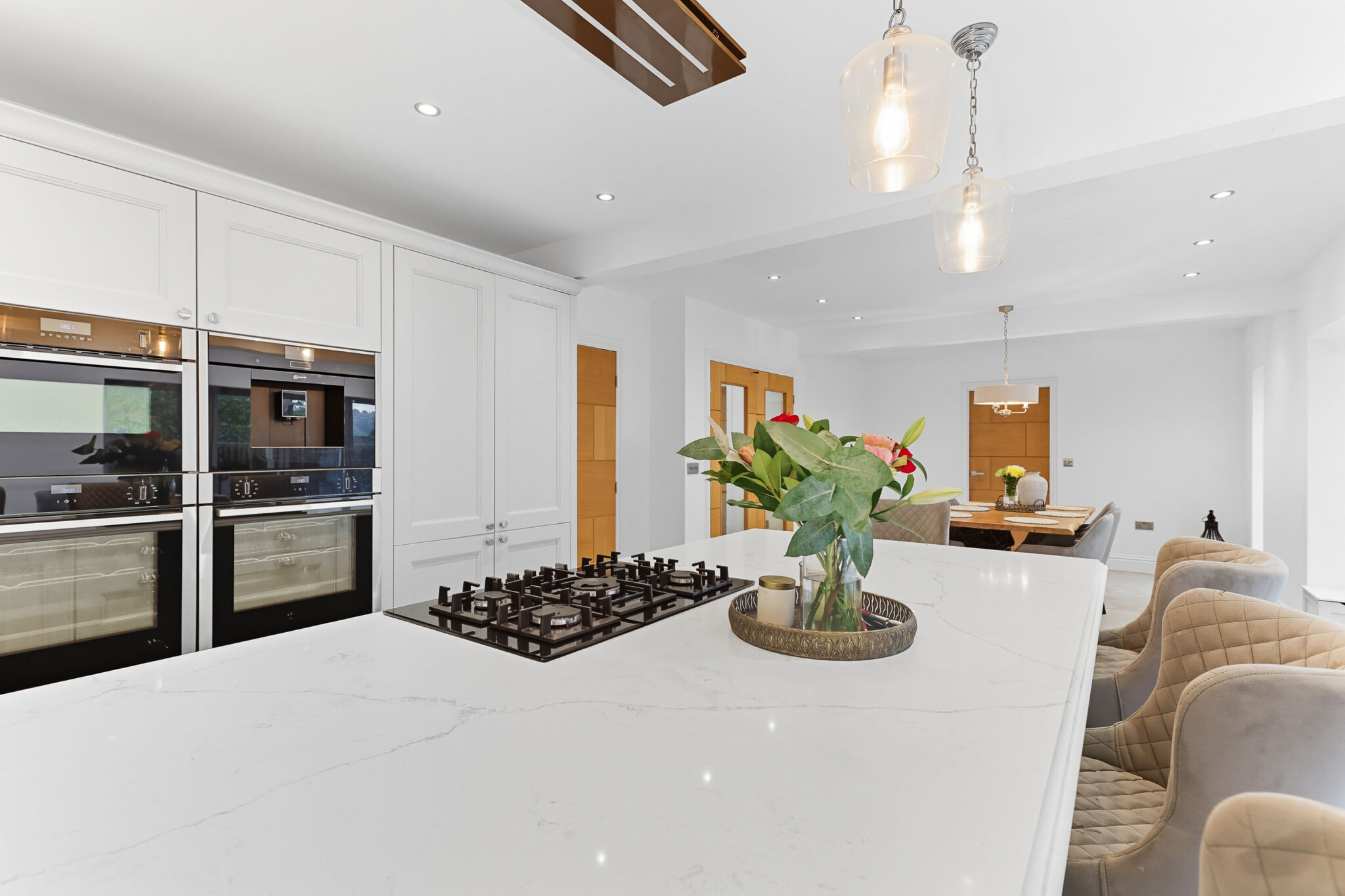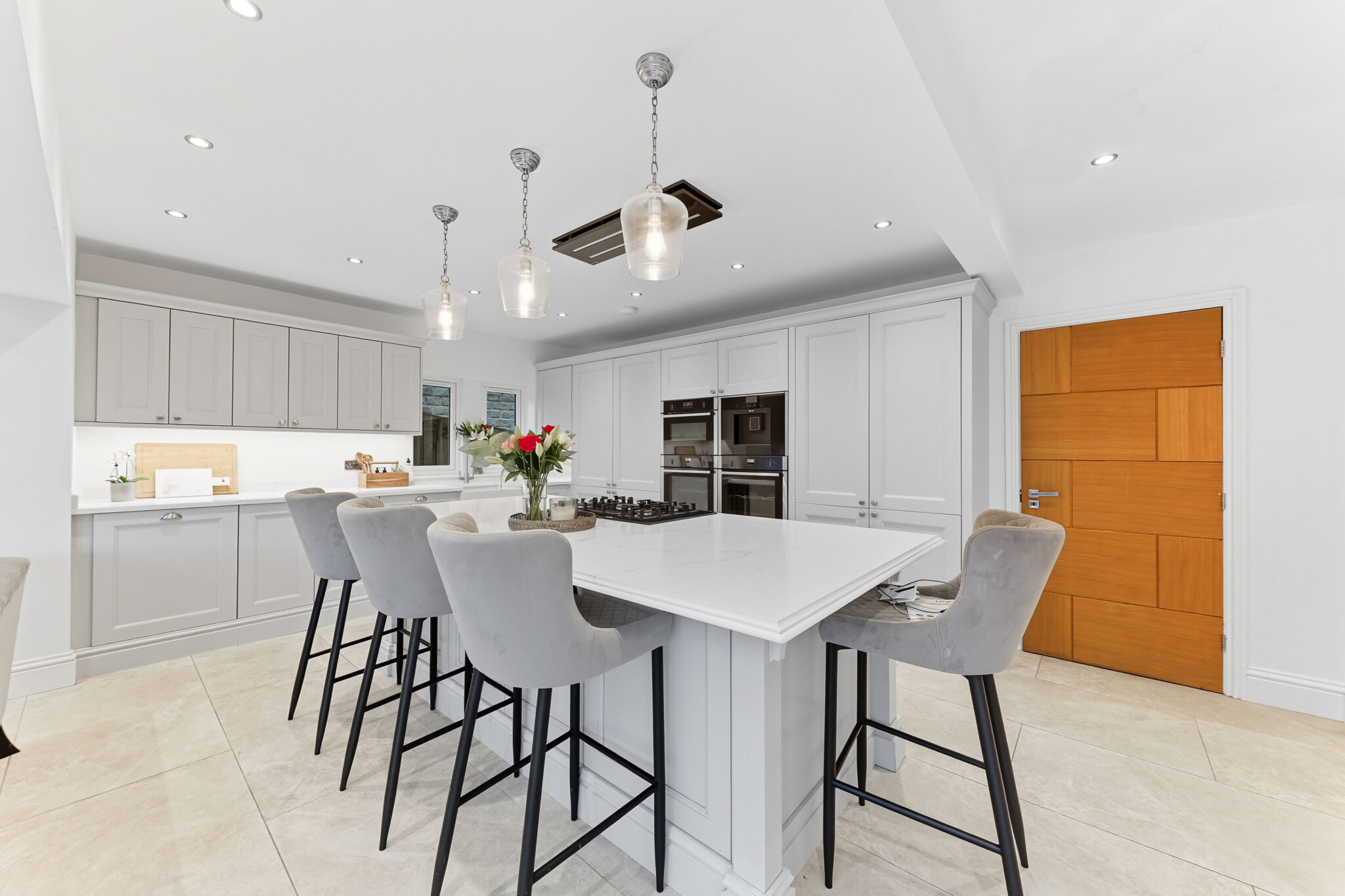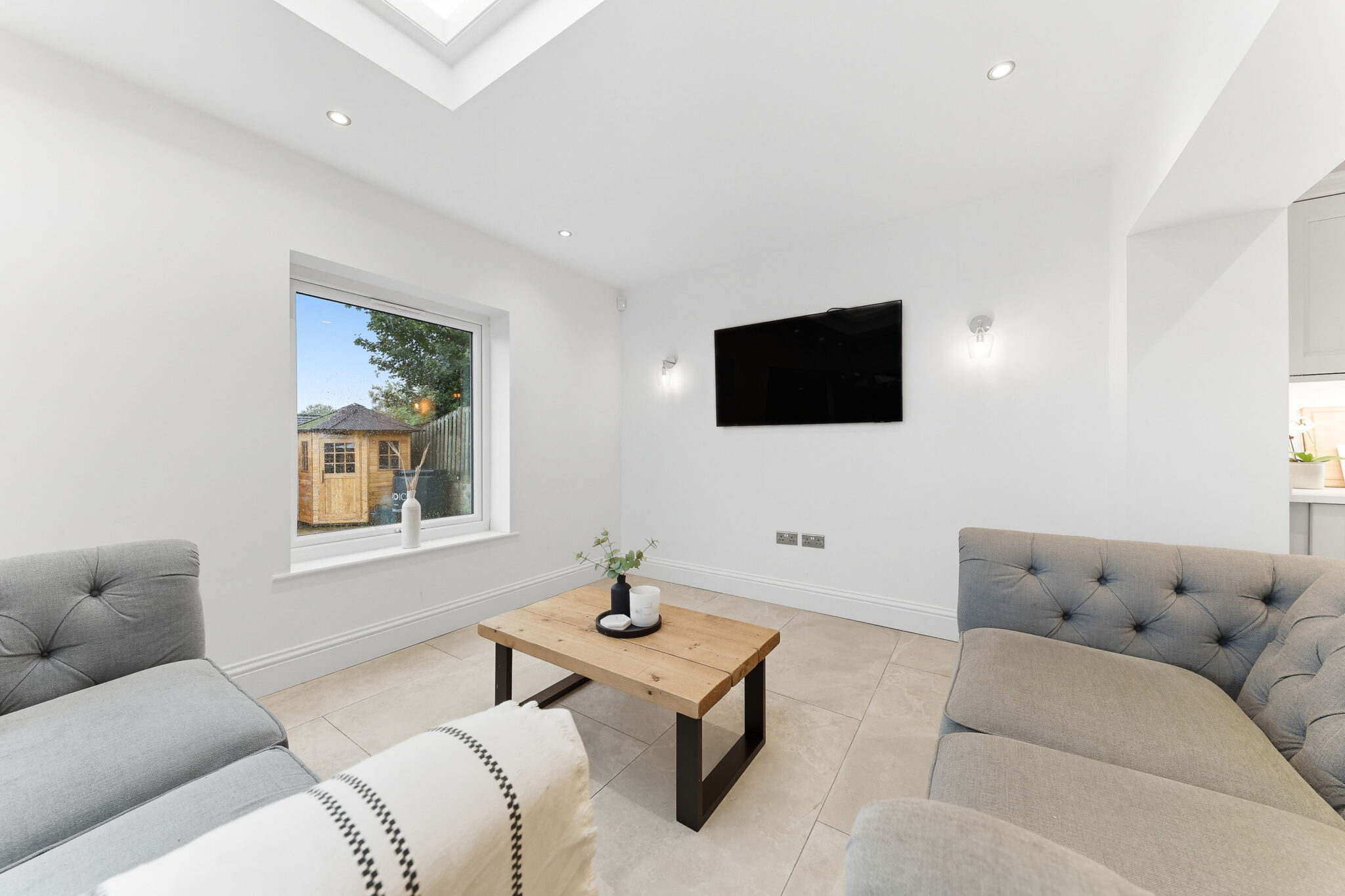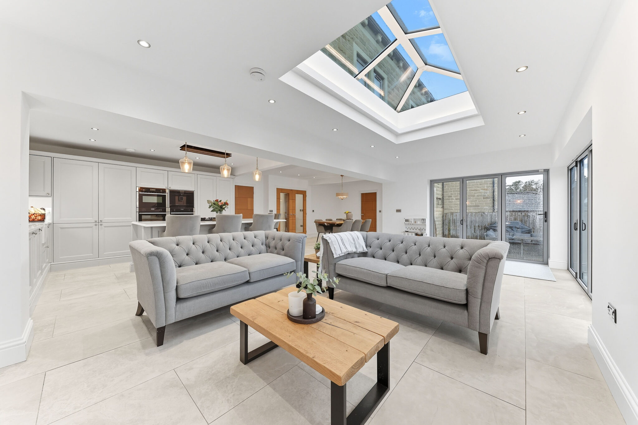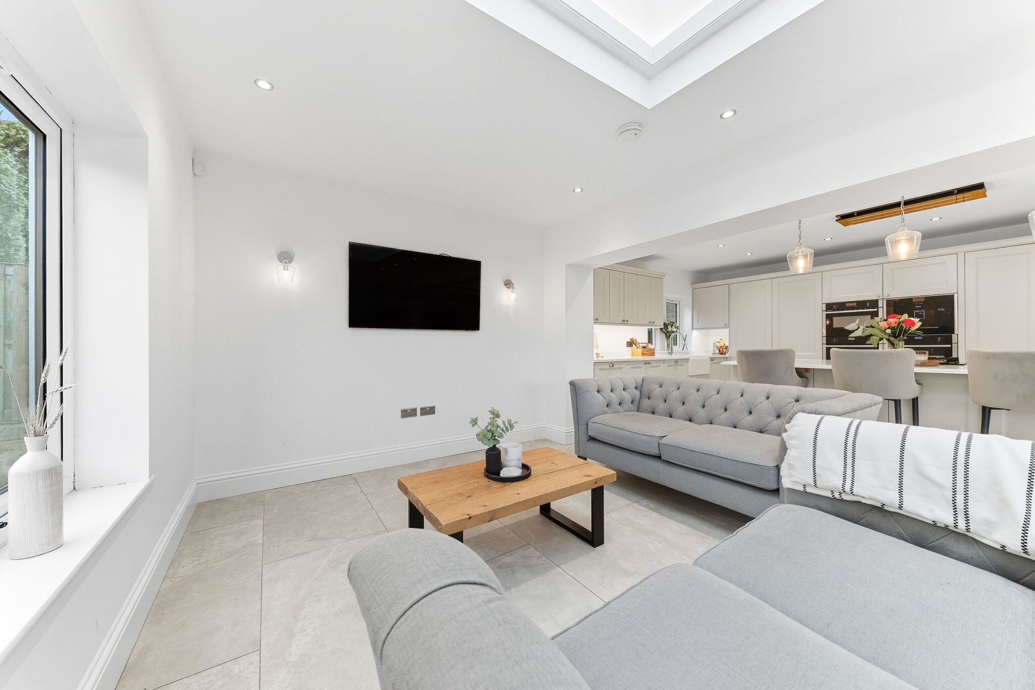 The kitchen then leads effortlessly into a more formal dining area with space for a large suite. Alternatively the seating area overlooks the beautiful garden and boasts a skylight which floods the room with natural light.