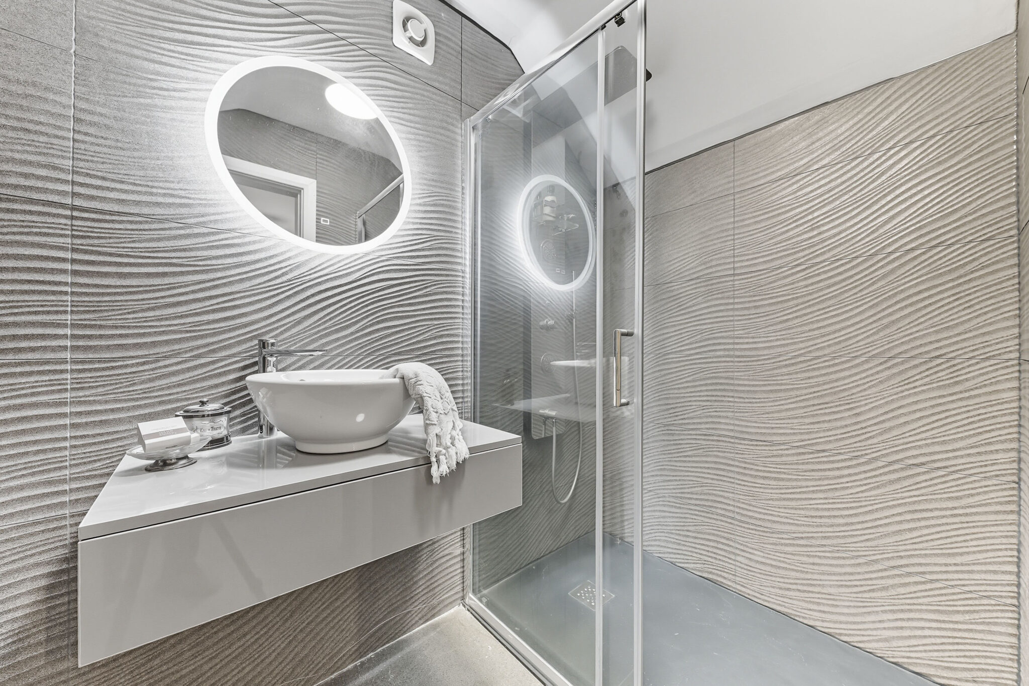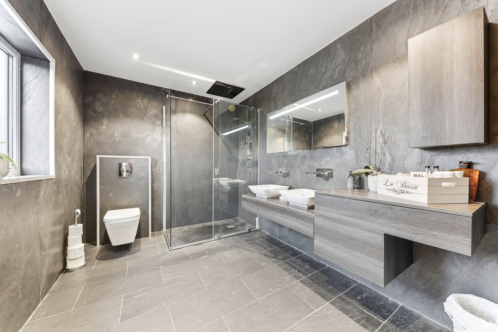 The third ensuite offers elegant grey tiled walls and a waterfall sink as well a spacious shower.
