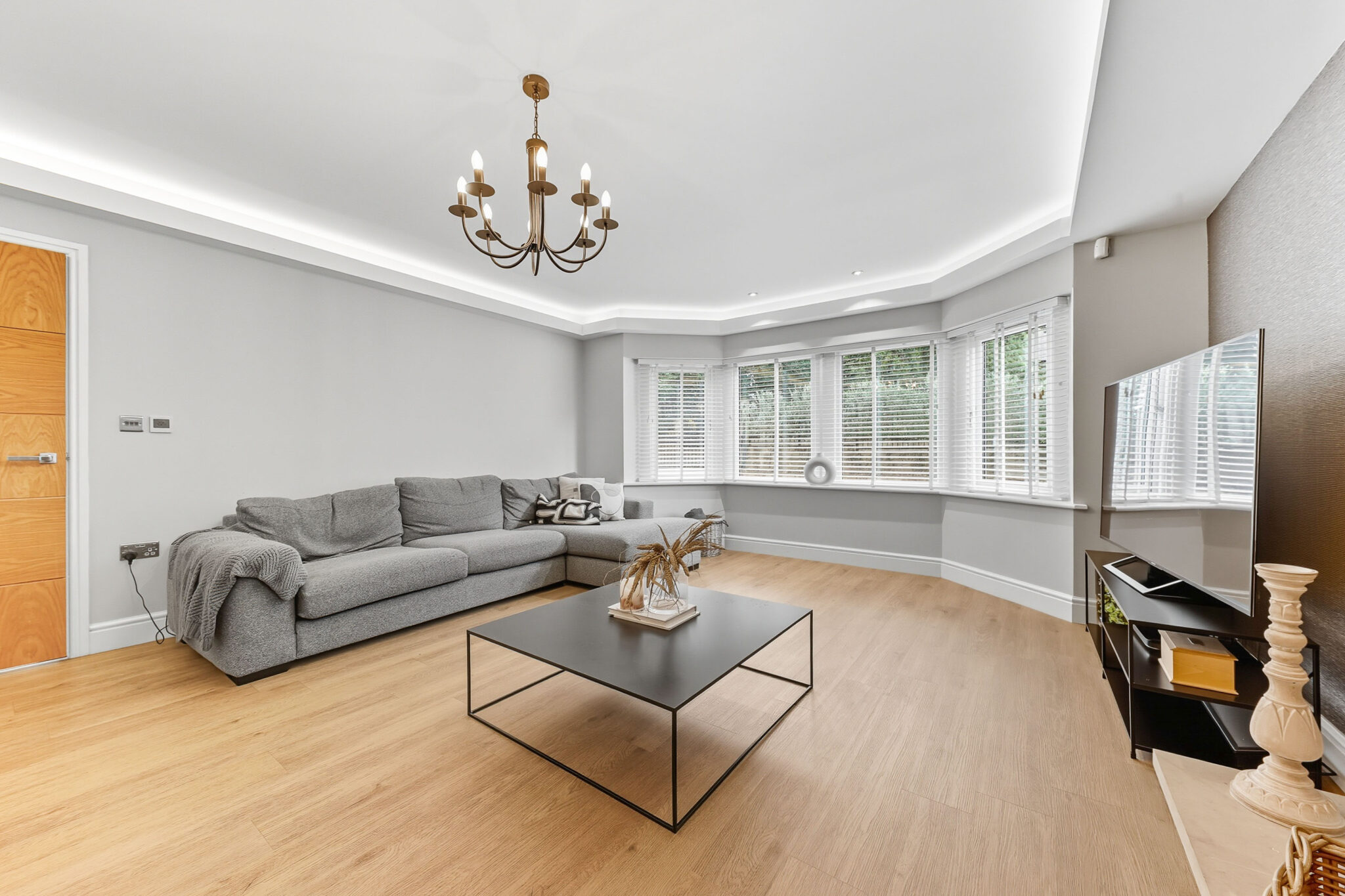 The stunning lounge sits to the front of the house and benefits from a beautiful bay window, elegant wooden flooring and softly painted walls.