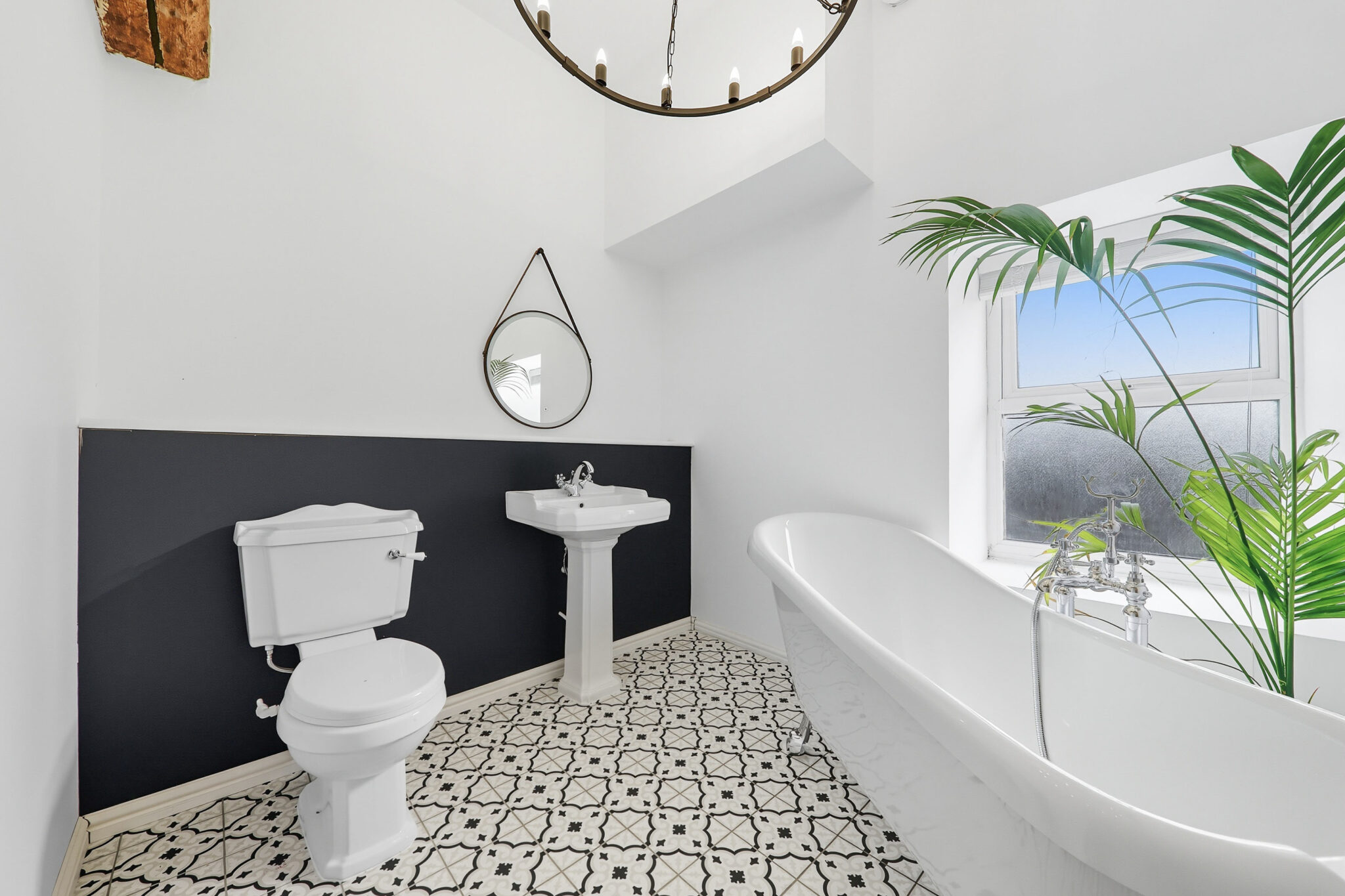 The beautiful bathroom has been finished to the highest of standards and boasts an elegant roll top bath that is perfect for relaxation alongside contemporary flooring, stunning panelling and a large window that floods the room with natural light.