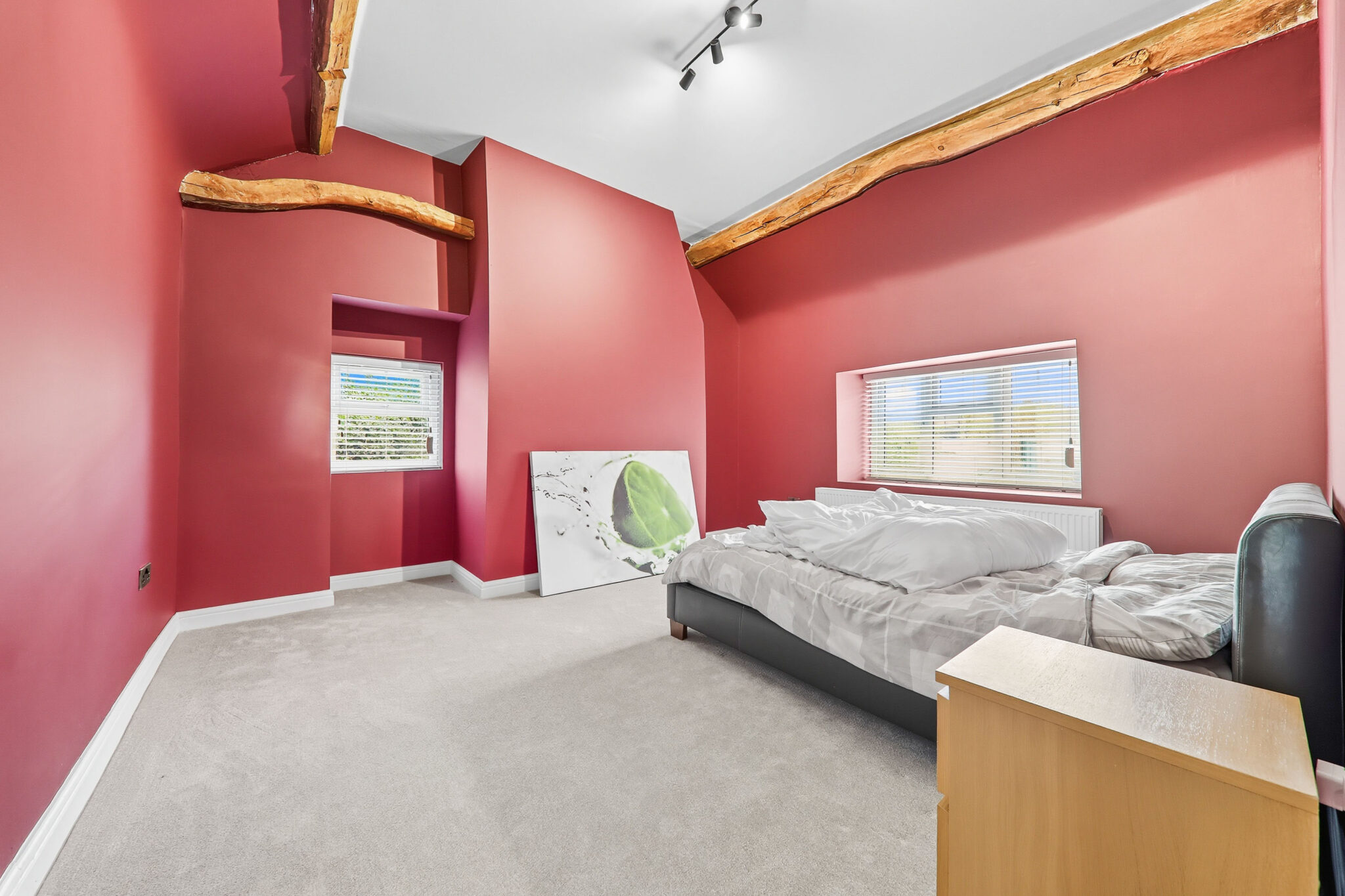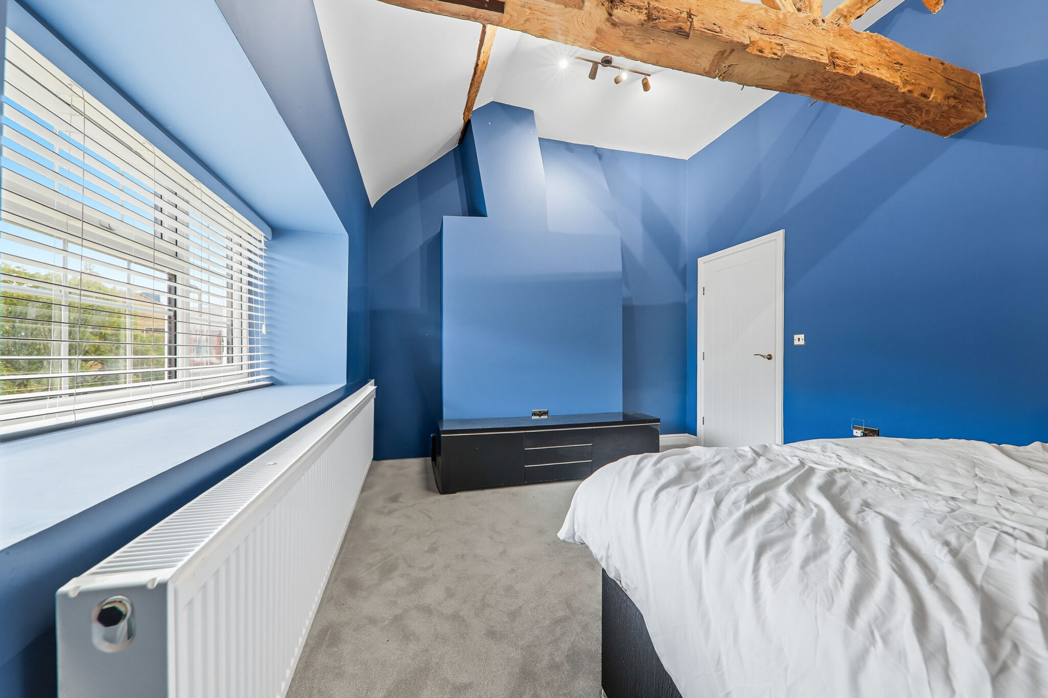 The second double bedroom benefits from wonderful proportions and offers striking blue walls, soft grey carpet and tasteful feature beams that pay tribute to the building's traditional heritage.