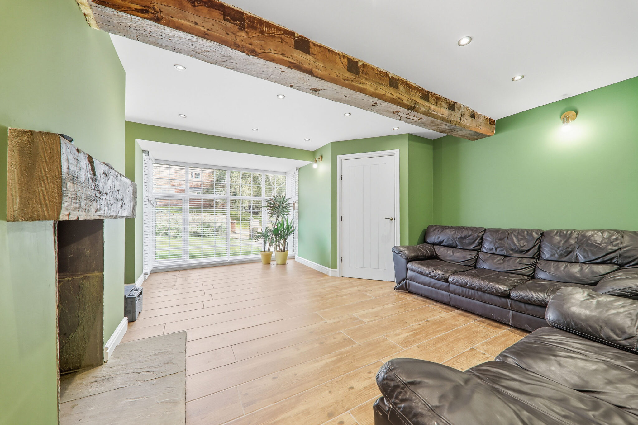 The stunning lounge flows effortlessly from the kitchen and is the perfect setting to relax. The room boasts a truly unique floor to ceiling bay window alongside elegant beams and a feature fireplace, all of which reflect the home's heritage.